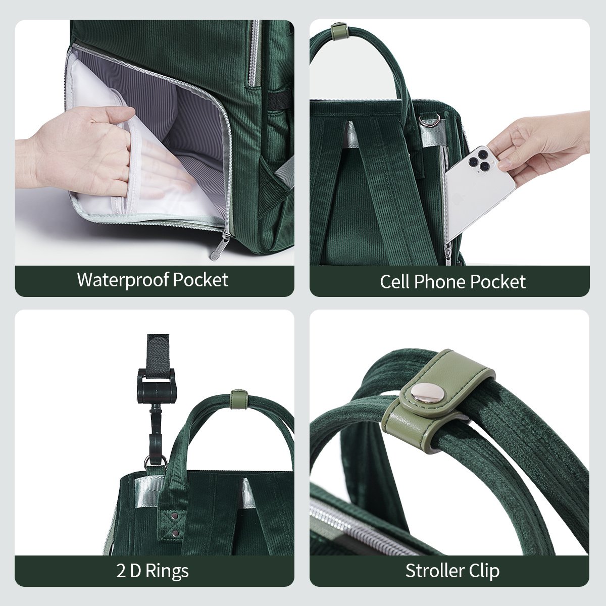 Velvet Material - The gorgeous velvet diaper backpack has a high luster pile.Durability - Adopts premium material and delicate workmanship for long service life.Practicality - Designed with large capacity and multiple pockets for different needs.Comfortable - The ergonomic back design and easy-grip handle offer comfortable wearing.Styles - Regarded as a diaper bag, backpack, handbag, or you can hang on the baby stroller.Convenience - Wide opening helps to easily take items in time.